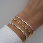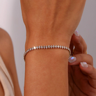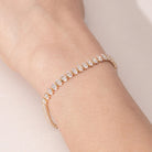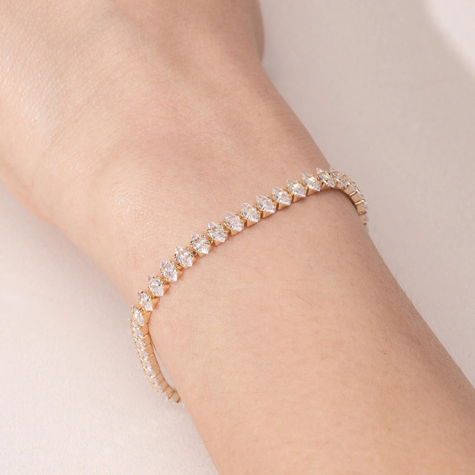 Enhance this traditional tennis bracelet with a contemporary touch - The bracelet boasts a unique elongated and curved style, embellished with marquise-cut stones measuring 4mm or oval-cut stones measuring 5mm. Whether worn alone or paired with other accessories, this versatile piece exudes timeless elegance and can be customized to your desired length with its adjustable chain.