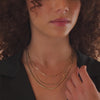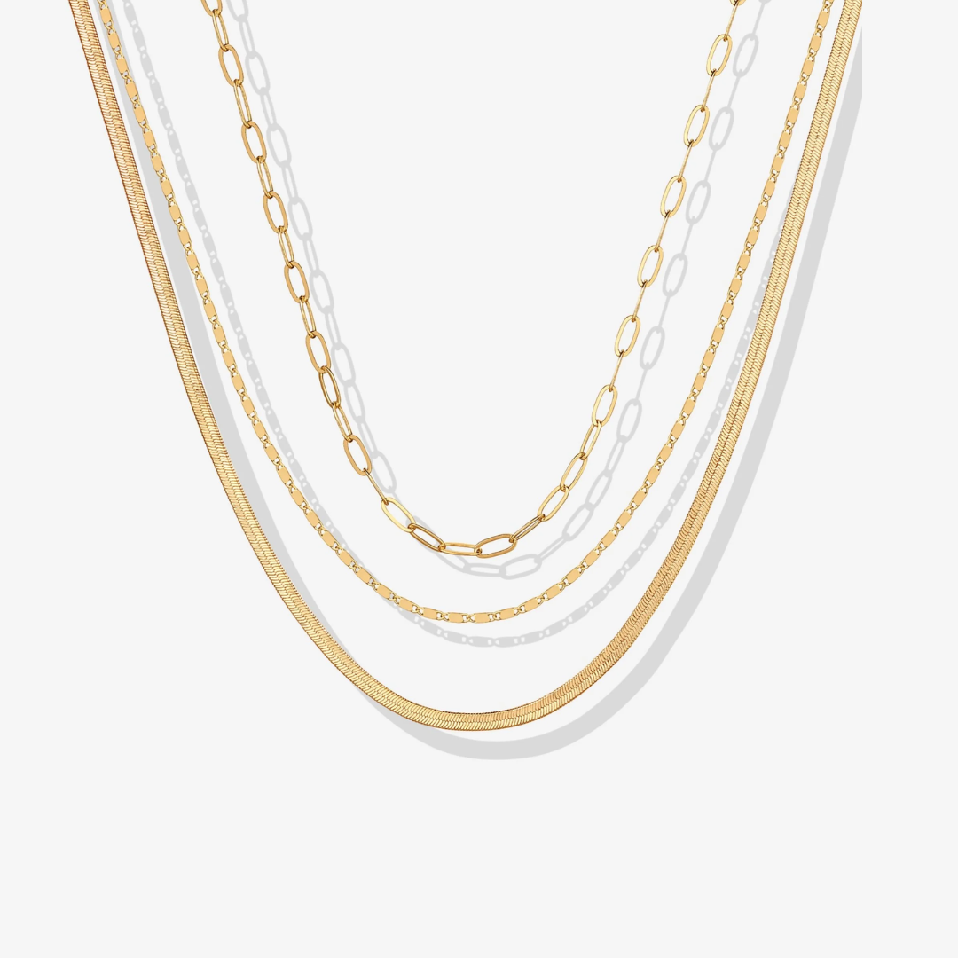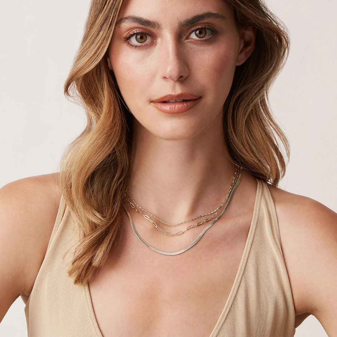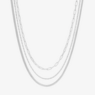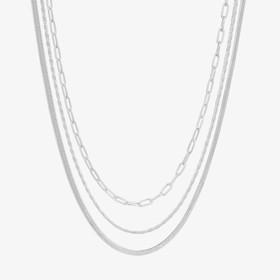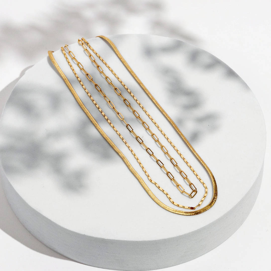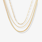 Elevate your style with our stunning Layered Chain Necklace. This exquisite piece features three layers of intricate chains, including a herringbone, paperclip, and linked chain. The result is a versatile and luxurious accessory that will elevate any outfit. Perfect for the fashion-forward, sophisticated individual.