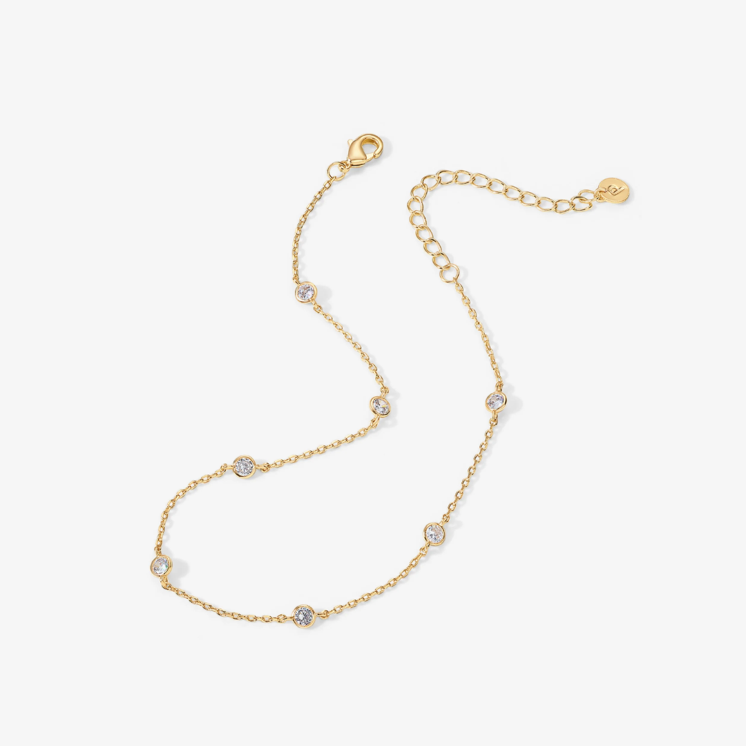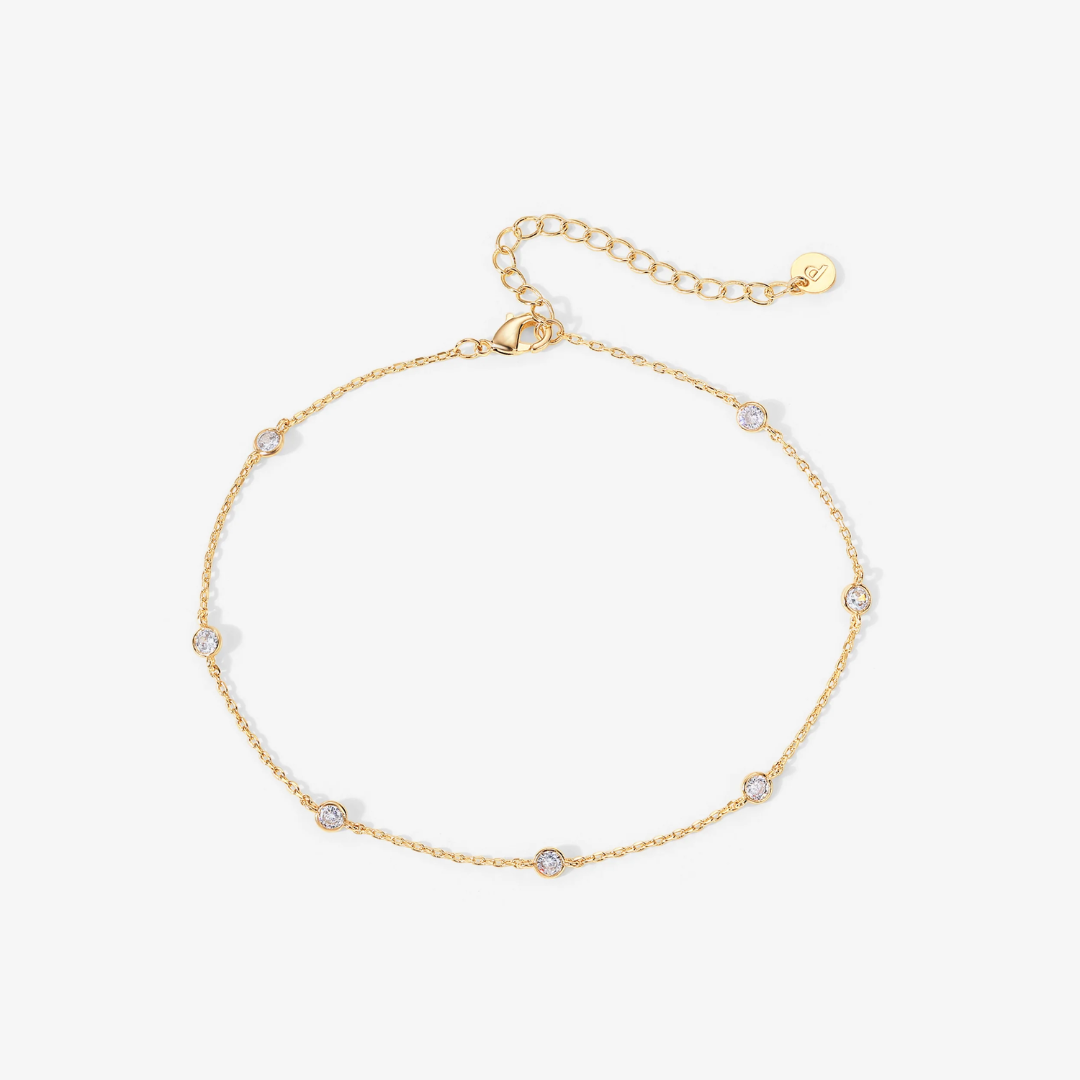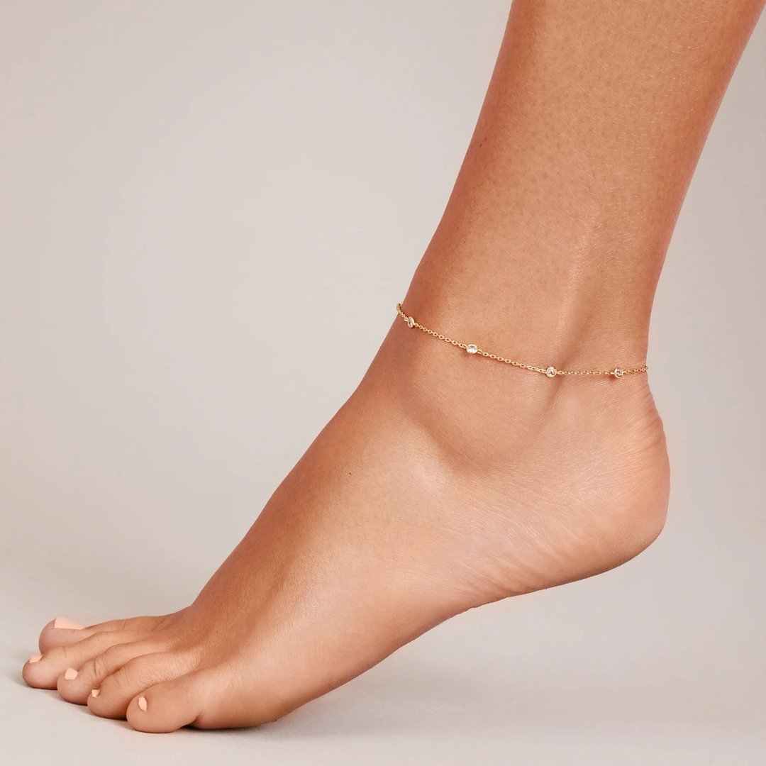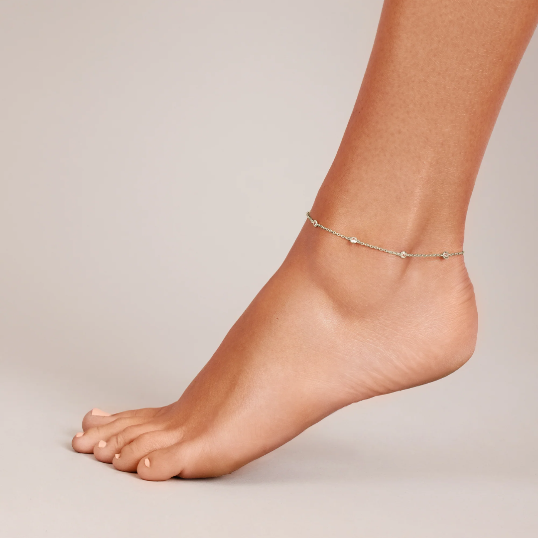 Experience the allure of summer with our Station Anklet. Adorned with premium cubic zirconia and delicate chain links, this 9-inch anklet with a 2-inch extender will elegantly drape around your foot. A timeless combination of love and beauty, perfect for any occasion.