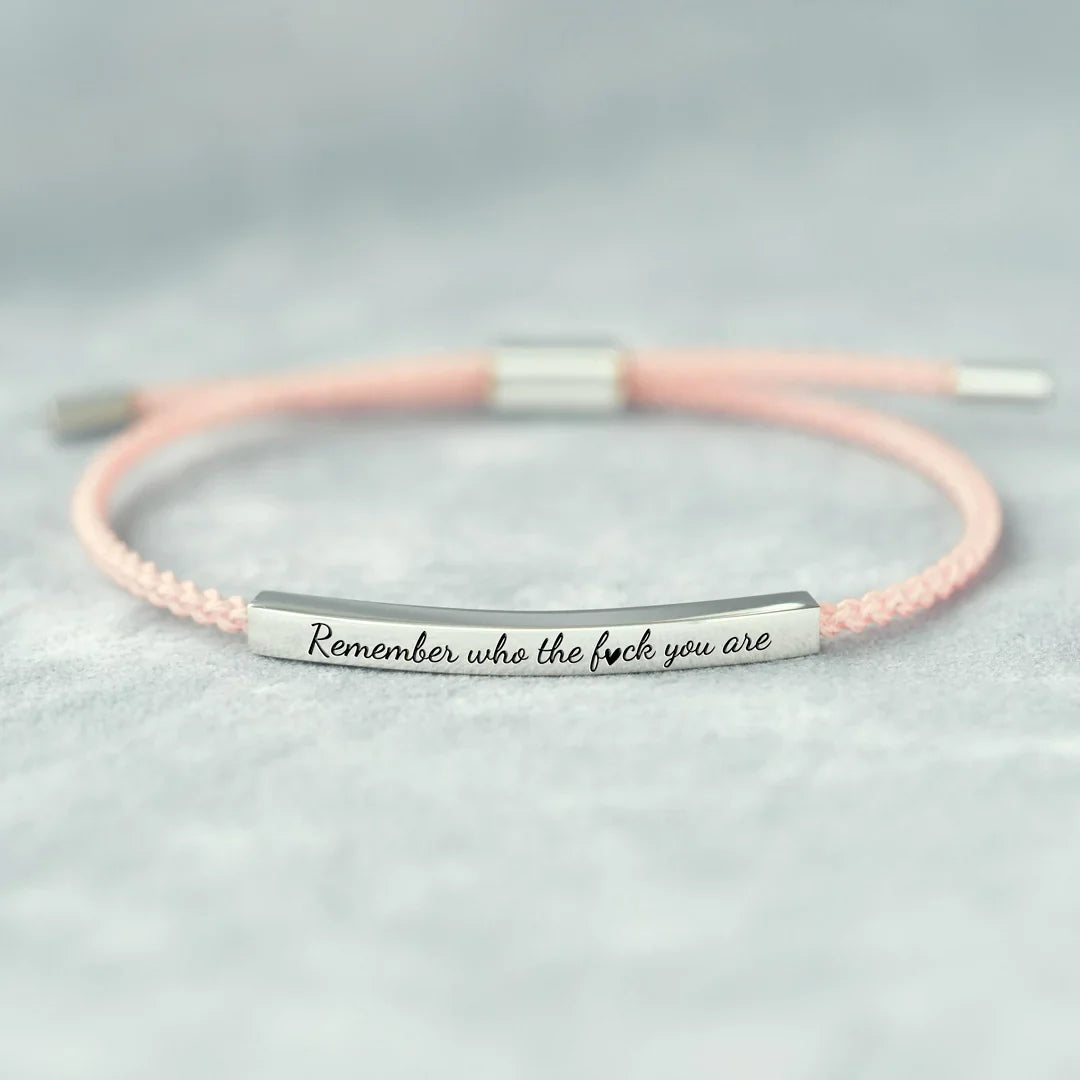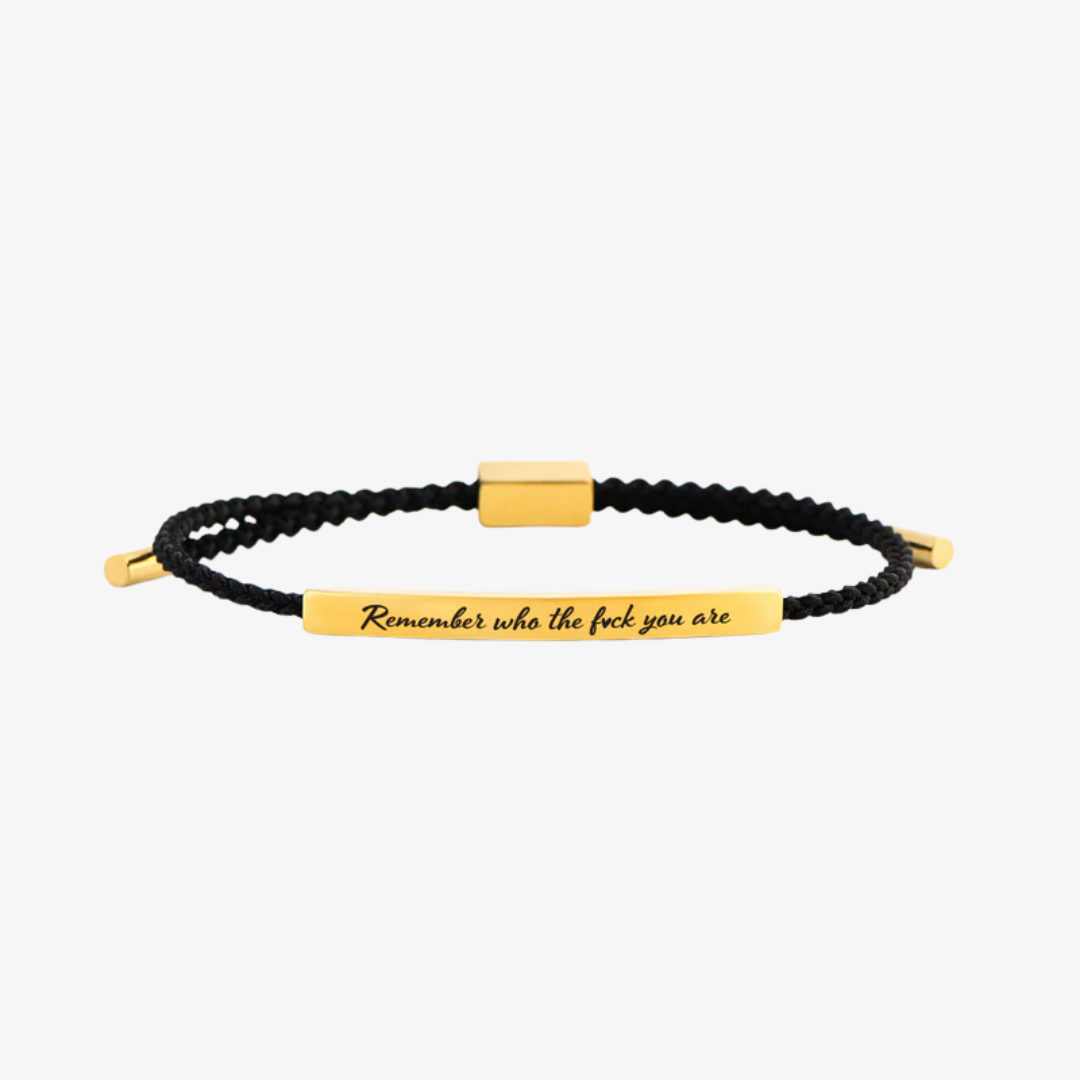 This light hearted reminder of "Remember Who the Fuck You Are" bracelet serves as a daily affirmation, discreetly empowering you to maintain your authentic self. The sleek tube design offers a refined aesthetic while carrying a powerful message that encourages self-confidence and personal integrity throughout your day.