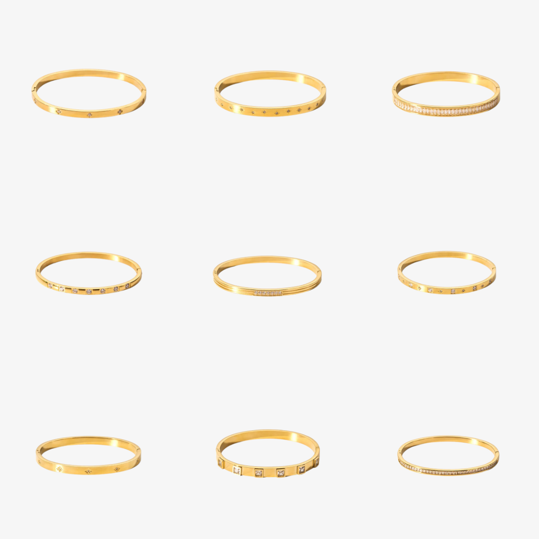 Indulge in the ultimate luxury of the Juliette 9-Piece Bangle Bracelet Set. This stunning set features nine unique bangle designs crafted in gold and adorned with sparkling cubic zirconia diamonds. Elevate your look with a touch of elegance and glamour.