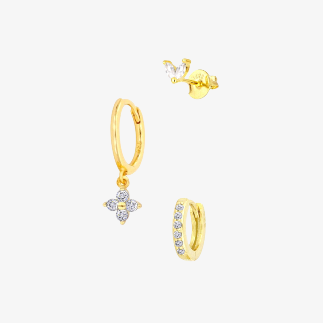 Introducing our exquisite Clover Leaf Earrings Set. This set features three pieces, a mix of stud and hoop earrings, perfect for everyday wear. Elevate any outfit with these elegant, timeless earrings. A must-have for those who appreciate luxury and sophistication.