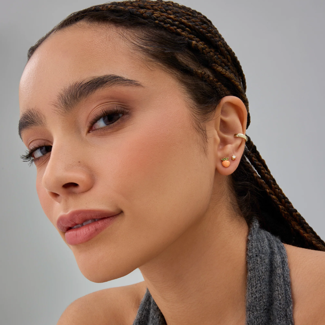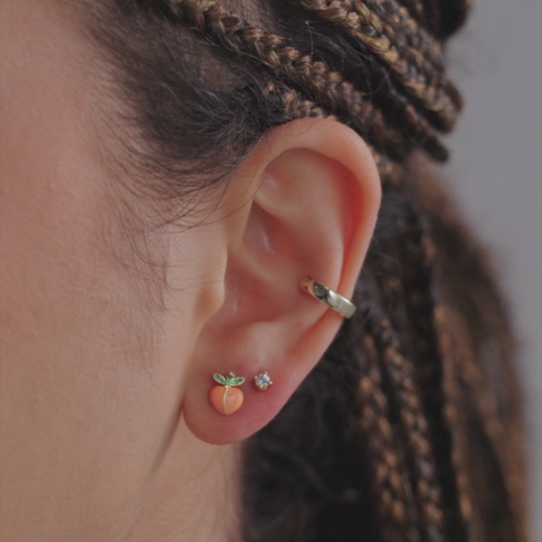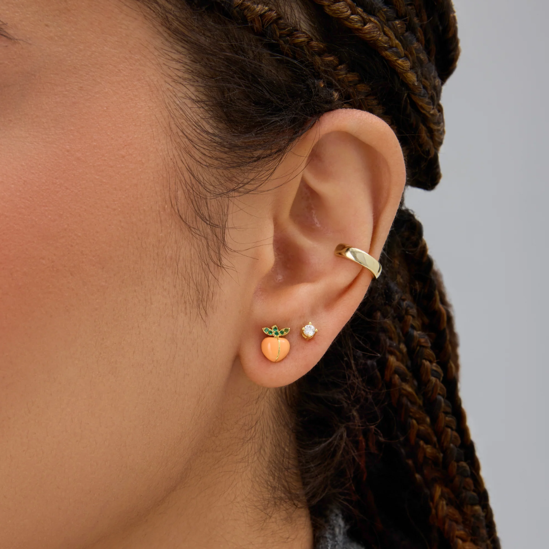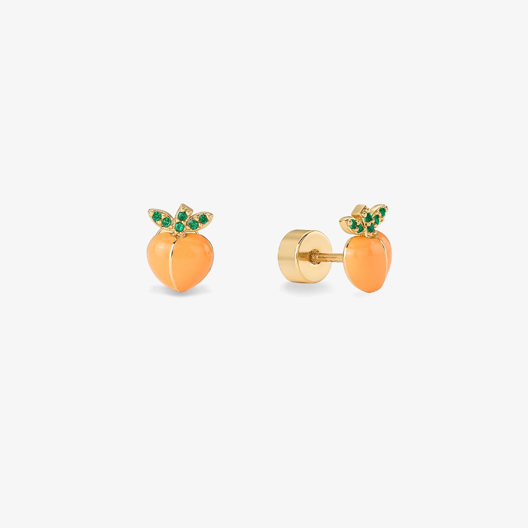 Feel bold and fresh with these Peach Flat Back Studs. Crafted with enamel-coated peaches and finished in 14K gold plating, they bring a juicy pop of color and playful charm to your look. Perfect for stacking or wearing solo, these earrings turn heads with fruity flair and fearless style.