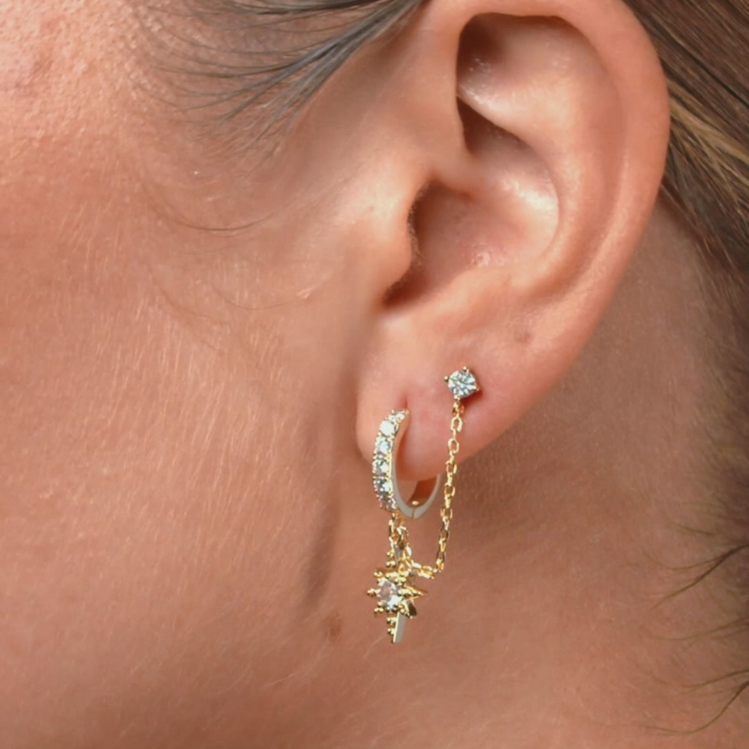 The Starlight Chained Huggie Earrings feature an 8mm diameter CZ huggie paired with an 11.5mm by 9mm dangling star charm, connected by a delicate 30mm chain. Complemented by a 3mm CZ stud, this set is designed for women with multiple piercings, offering a refined and elegant look. Crafted with premium AAAAA cubic zirconia, these earrings add a sophisticated sparkle to any ensemble.