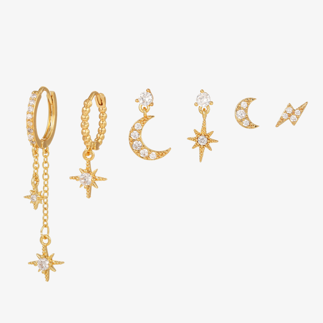 Indulge in the celestial charm of our Moonlight Earring Charm Set. This 6 piece set features diamond embedded moon, stars, lightening, and spark charms for a dazzling and mystical feel. Perfect for adding an extra touch of glamour to your evening night out. Elevate your style with this luxurious and exclusive earring set.