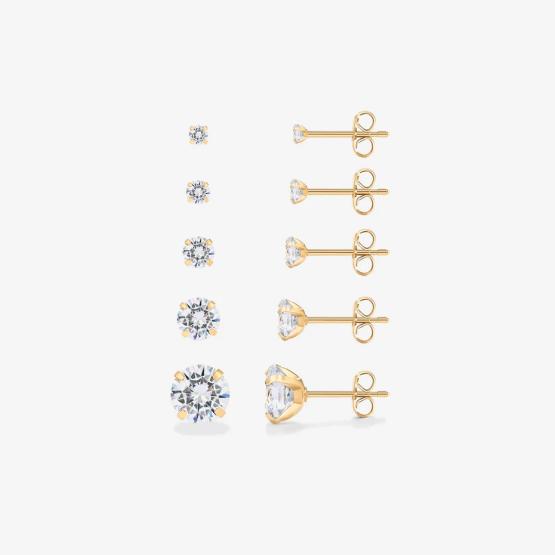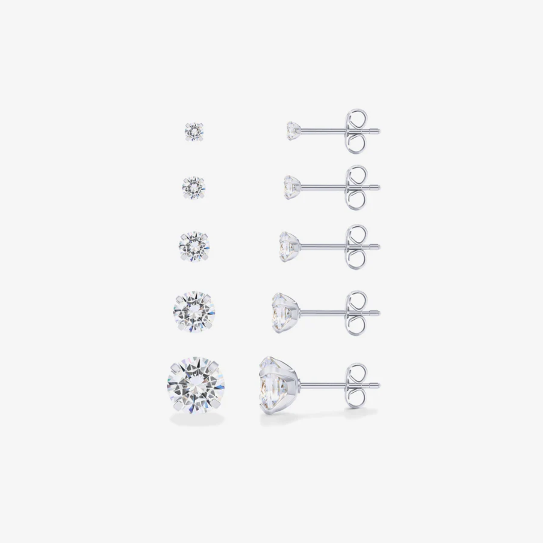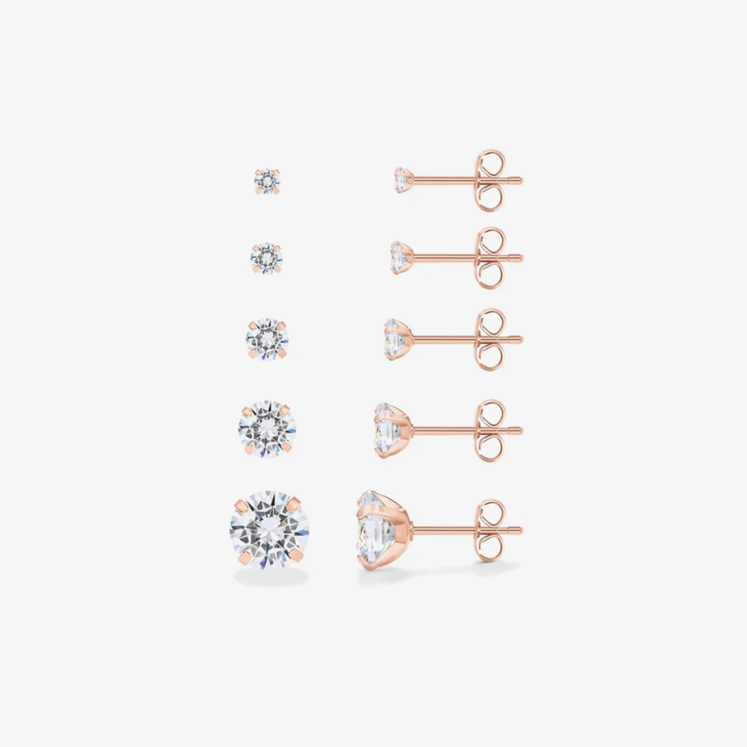 Elevate your ensemble with our exquisite 5 Pairs Stud Earring Pack. This refined collection features varying dimensions of cubic zirconia stones that brilliantly reflect light with every movement. The versatile assortment transitions seamlessly from daytime sophistication to evening allure, providing timeless elegance for your jewelry collection.