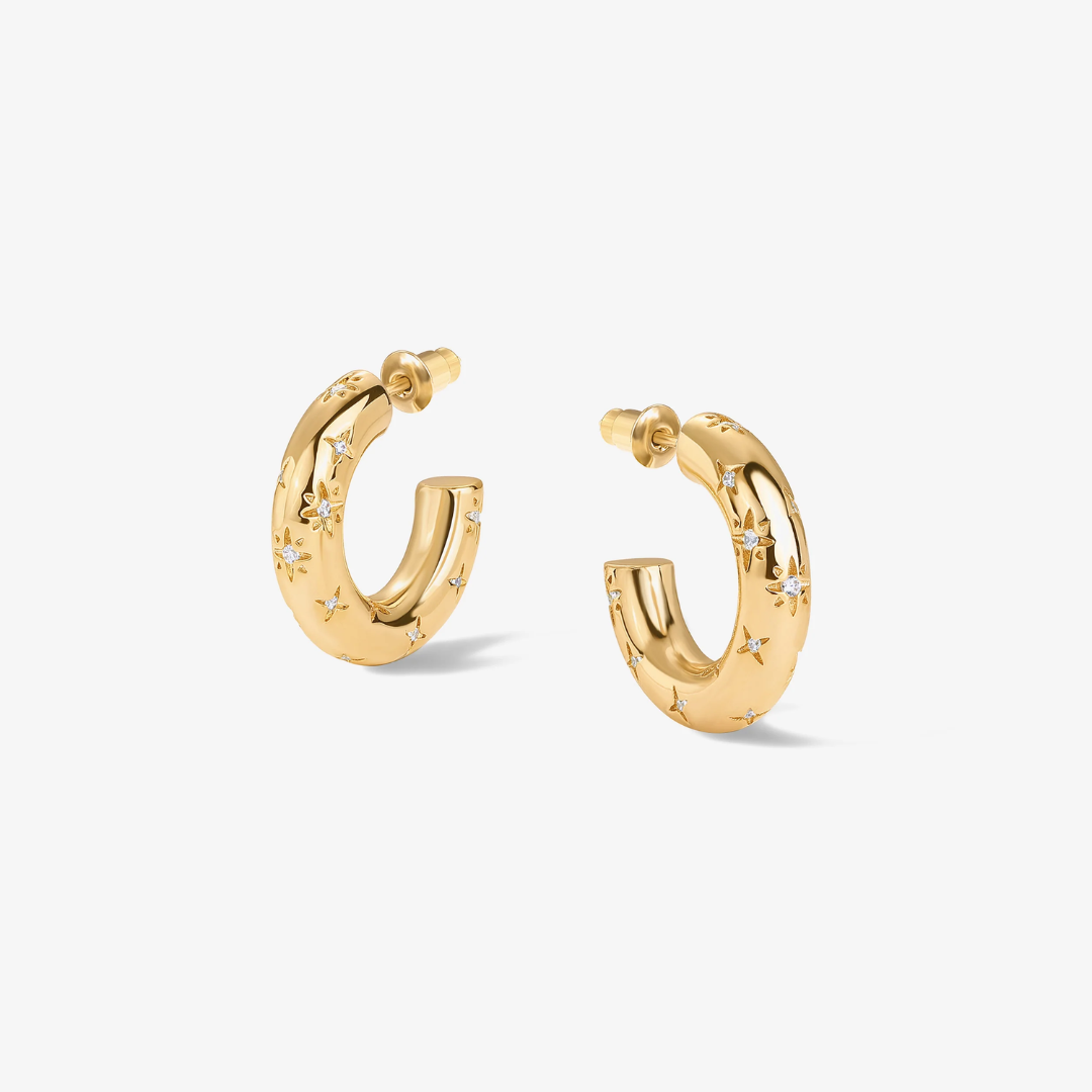 Dance among the stars with our Cosmic Hoops! These cheeky little huggies feature fun star engravings and twinkling crystals that'll make your ears the life of the party. Mix and match them in your ear stack or let them shine solo—either way, they're ready for adventure! These cosmic cuties are your ticket to a playful galaxy of style that's light-years ahead of boring accessories.