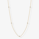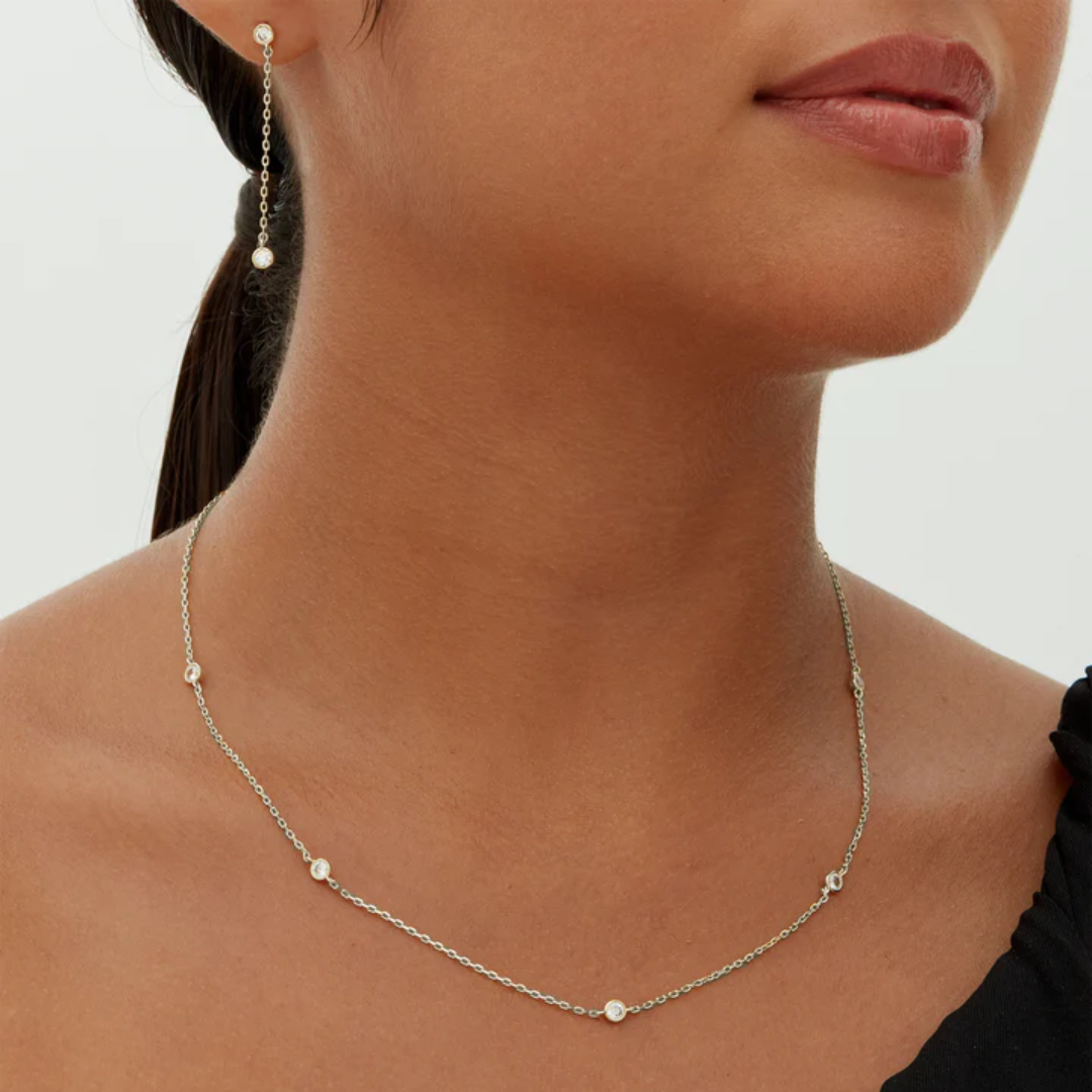 This station necklace is the epitome of luxury. Crafted with high-quality cubic zirconia's elegantly bezel set in five stations on a 14K gold-plated cable chain, this necklace exudes sophistication. Its timeless design and versatility make it the perfect layering piece for any occasion. Elevate your style with this stunning simulated diamond by the yard necklace.